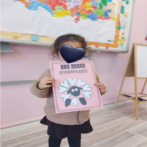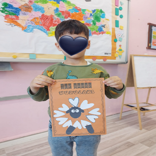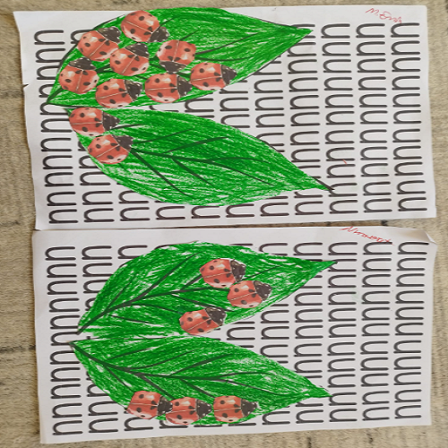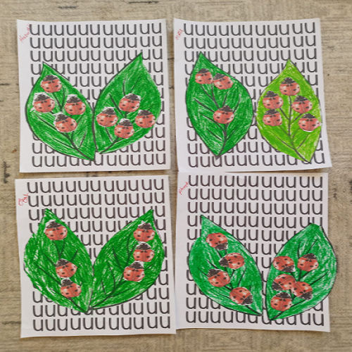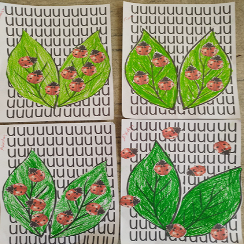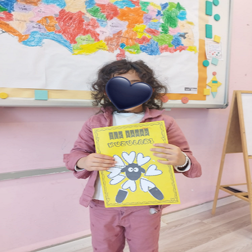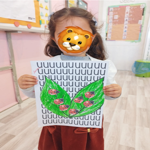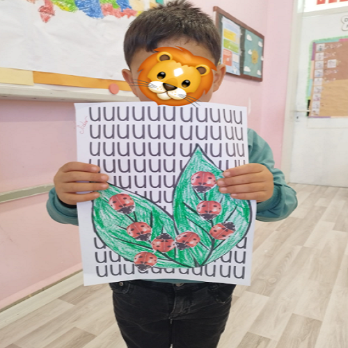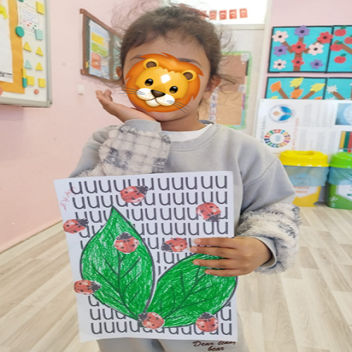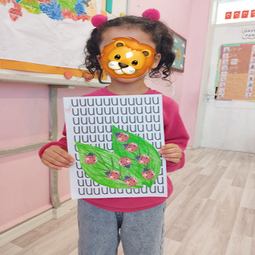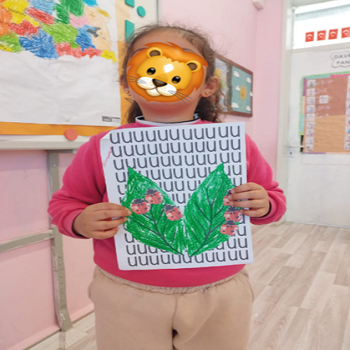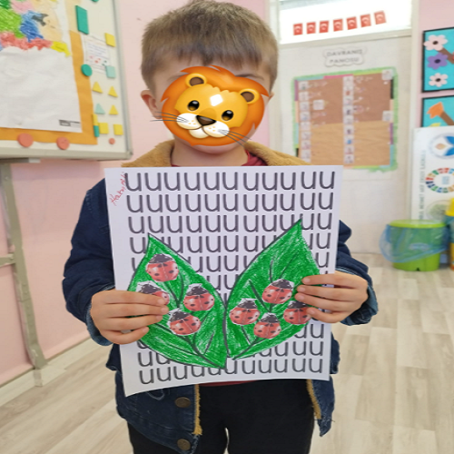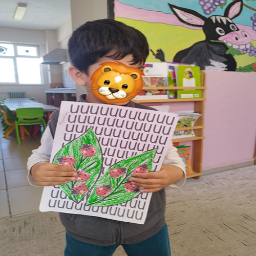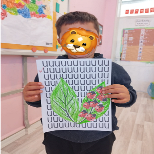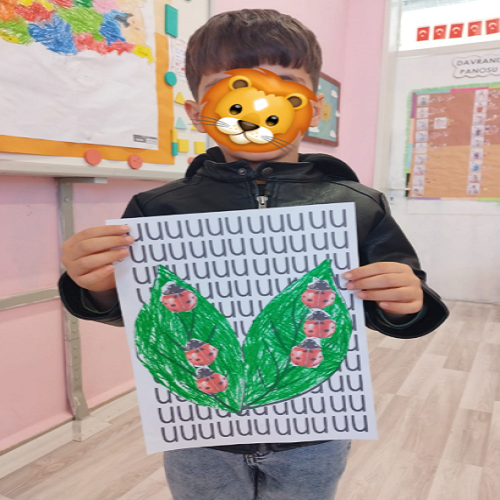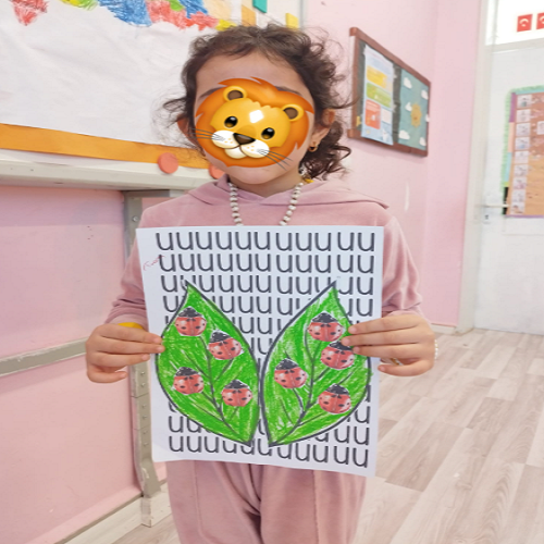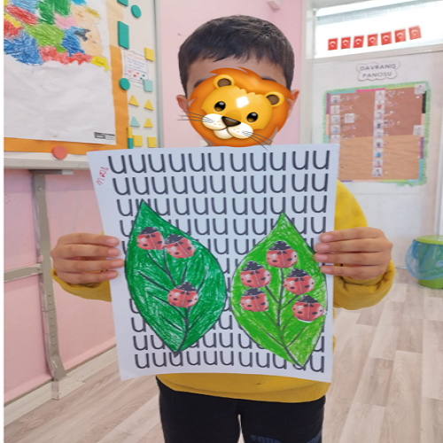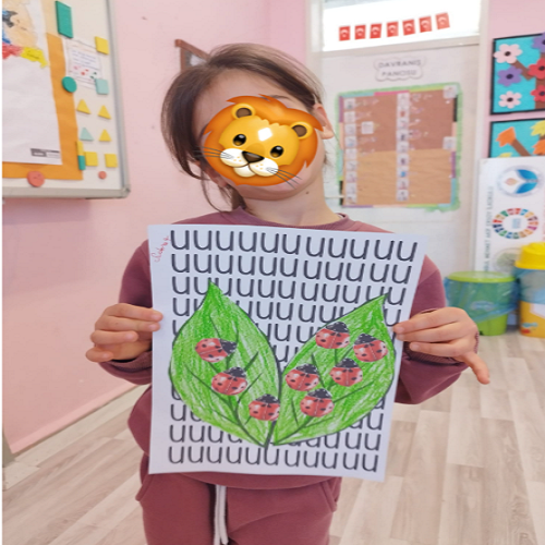 Hikâye etkinliğinin ardından çocuklar masalara yönlendirilerek önceden hazırlanmış uğur böceği kalıpları ve “U” sesi fonlu kağıtlar dağıtıldı. Boya–kes–yapıştır yöntemiyle “U sesi” temalı sanat çalışması gerçekleştirildi ve çocukların ince motor becerileri desteklendi.